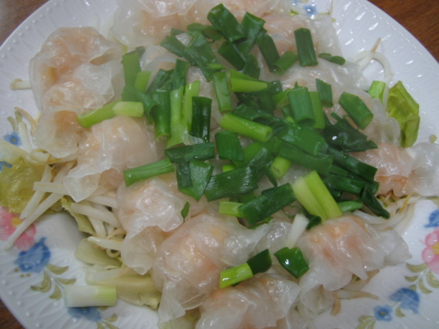 エビ餃子は、モヤシやレタスを敷いた上に乗せ、万能ネギを散らして、ラップしてチン。