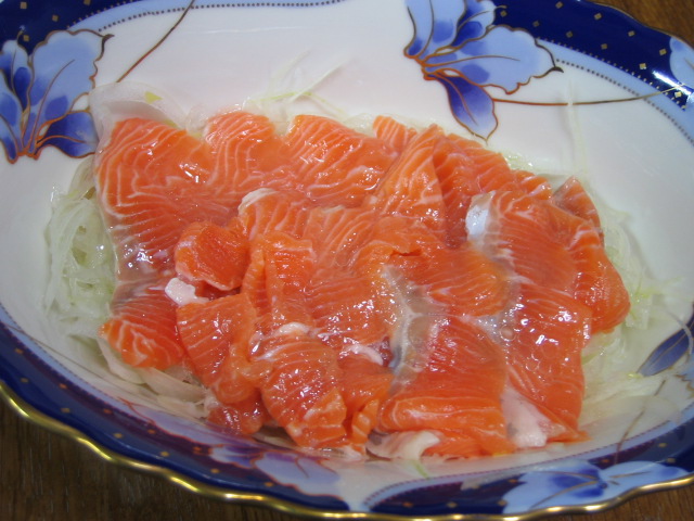 刺身用のサーモンを、スライス玉ねぎの上に並べ、フレンチドレッシングをかけただけの簡単なもの。