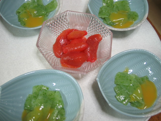 刺身コンニャクと並べたら、パレットに絵の具を搾り出したみたいに見える。