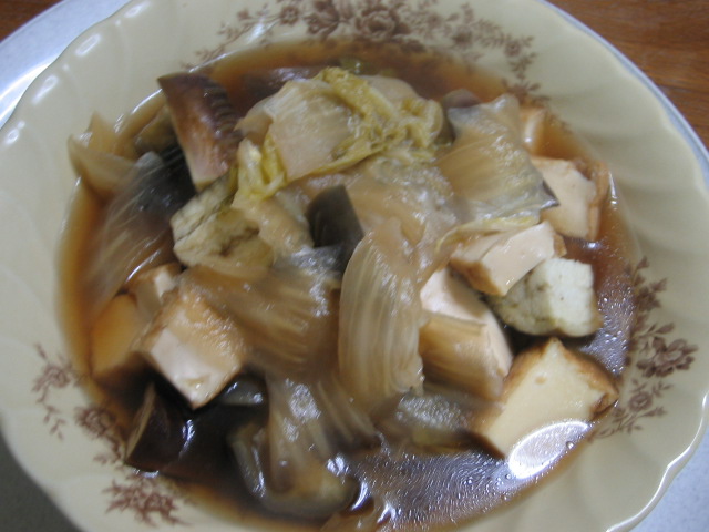 *鍋物(豆腐・ほうれん草・しめじ・ギョーザ・たぶん肉と魚も)
