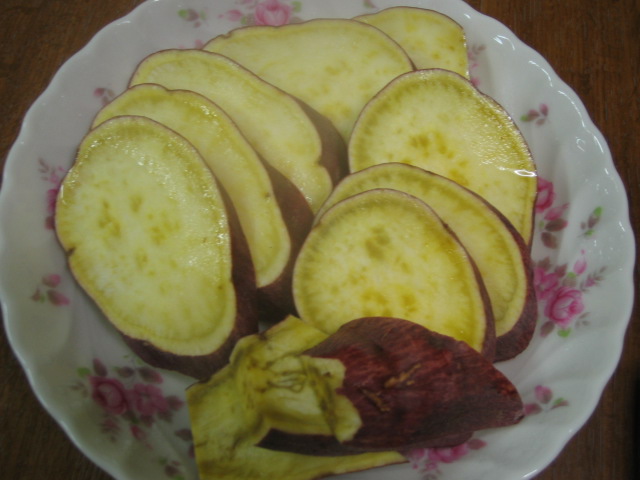 天ぷらのサツマイモは、あらかじめレンジでチンして、少し火が通った状態にしておく。