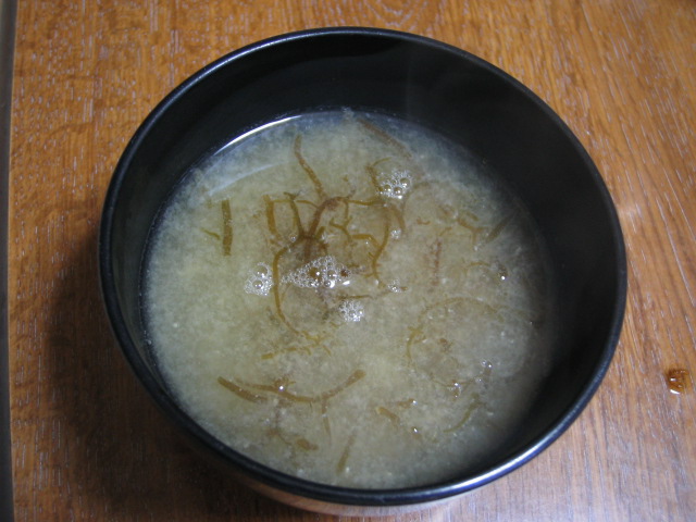 もずくの味噌汁は、まず具の入っていない味噌汁を作り、お椀にもずくを入れた上から注ぐ。