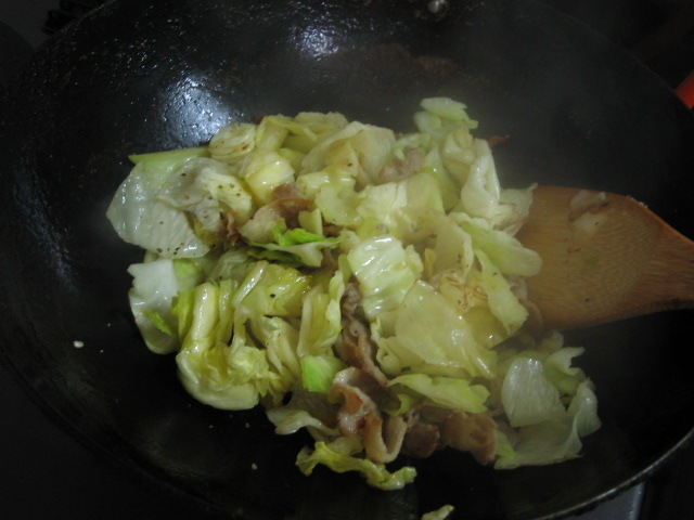 そんなこんなで炒めながら写真を撮ってみたが、「肉がベーコンみたいにカリカリ」と、またしてもダメ出し。